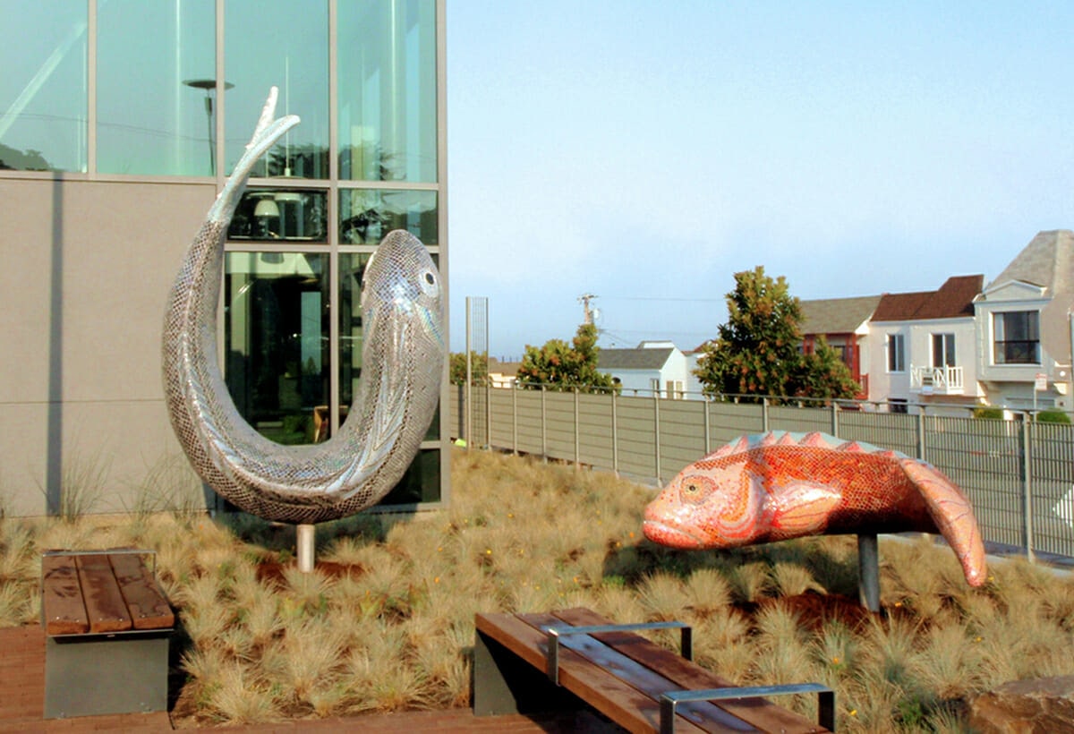 The artwork focuses on the significance of two “ordinary” fish that swim in the waters just off shore. Both fish, although relatively unknown, have played a vital role in the natural and cultural history of Ocean Beach.