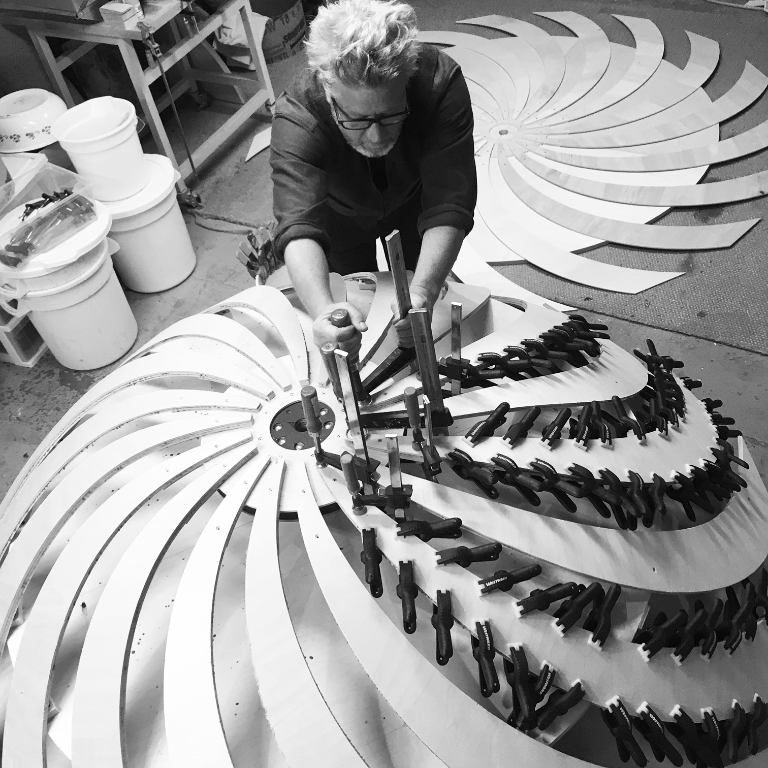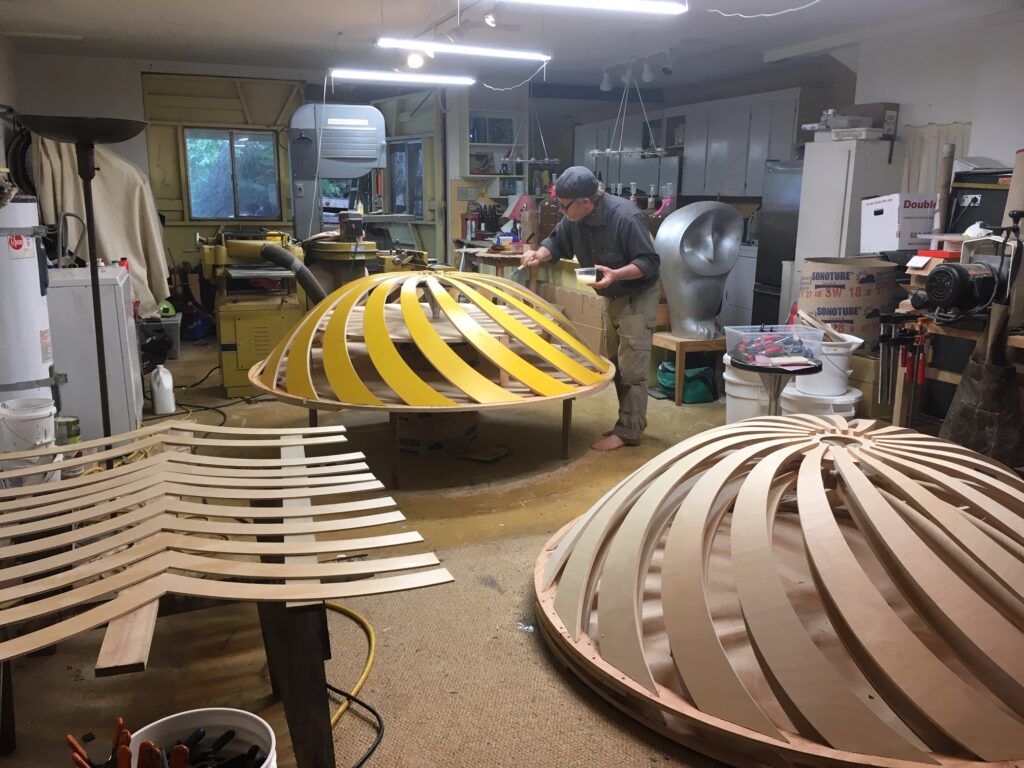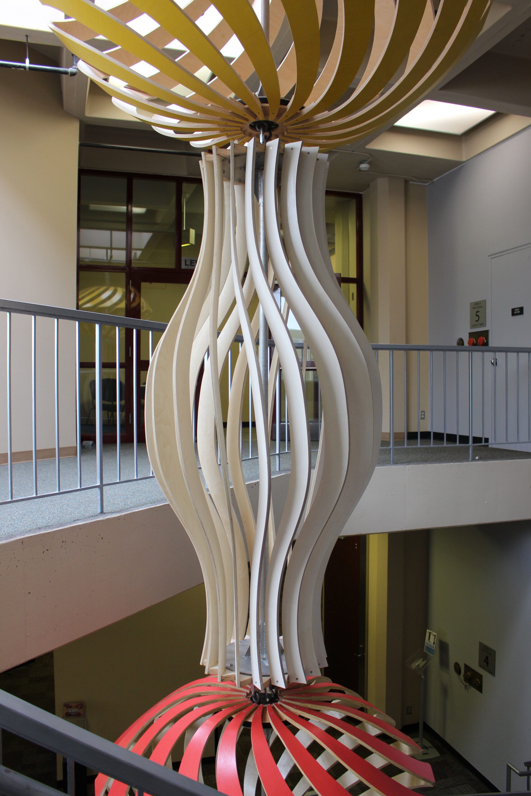 A suspended 26′ l x 7′ d sculpture activates a four-story stairwell. A series of hand-crafted, intricately patterned wooden sculptures descend in an undulating column from the ceiling on the fourth floor to the area above the seating area on the first floor. Conceived of as an interactive experience, the sculpture embodies the journey students take at Pierce College: traversing the staircase, the artwork animates, creating myriad compositions that shift and change, just as student’s perspectives evolve and grow as they pursue their education. The diversity of perspectives evoke the spectrum of cultures, ideas, and viewpoints that thrive at Pierce College.