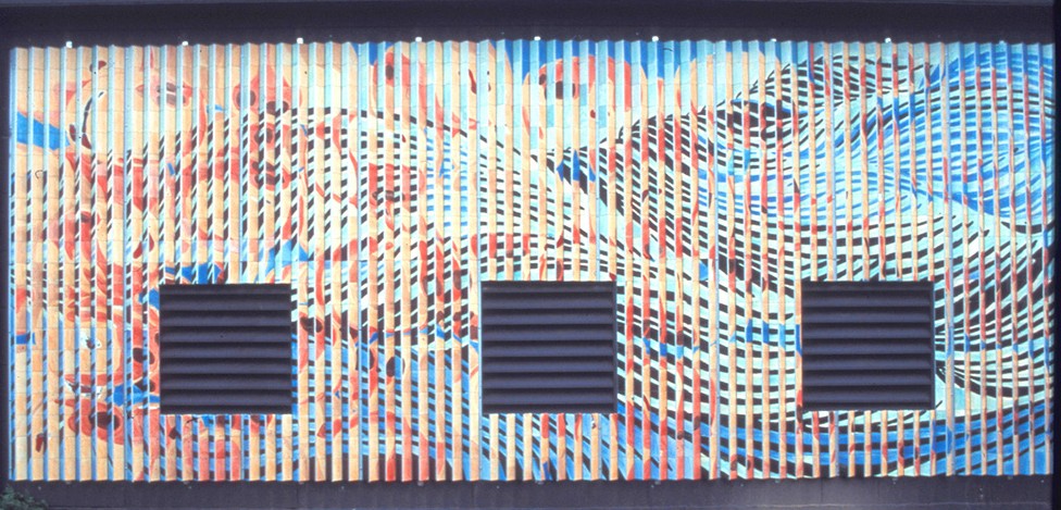 The Calaveras Murals are 12 interactive murals. In a unique “ceramic lenticular mural” system invented by Wowhaus, two images are mounted on a single corrugated steel substrate; the images shift and change as viewers walk past. Viewed head-on, the patterns interpenetrate. This system enables Wowhaus to invite large-scale community participation in the creation of a monumental work; many people can contribute to the conception and creation of the mural, emphasizing collective collaboration. The murals reflect the unique ecosystem of the Calaveras River. Many children hadn’t realized that the Calaveras River flowed by their schools; over 200 students ages 6-18 contributed to the creation of the murals. Students accompanied Wowhaus on expeditions to the river itself, observing wildlife and the ecosystem first-hand.