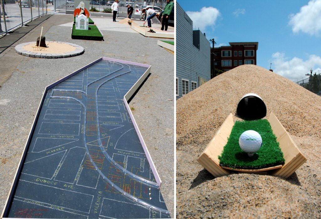 The Hayes Valley Historic Miniature Golf Extravaganza was an interpretation of the cultural and physical geography of a San Francisco neighborhood in the form of a participatory game accessible to all ages. Playing the nine-hole course told the story of layers of opportunism, related spectacle and struggle, redeemed by recent neighborhood activism leading to the social and economic revitalization of a thriving community. The project was intended to be at once educational, challenging and fun.