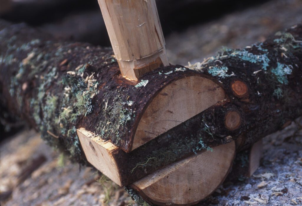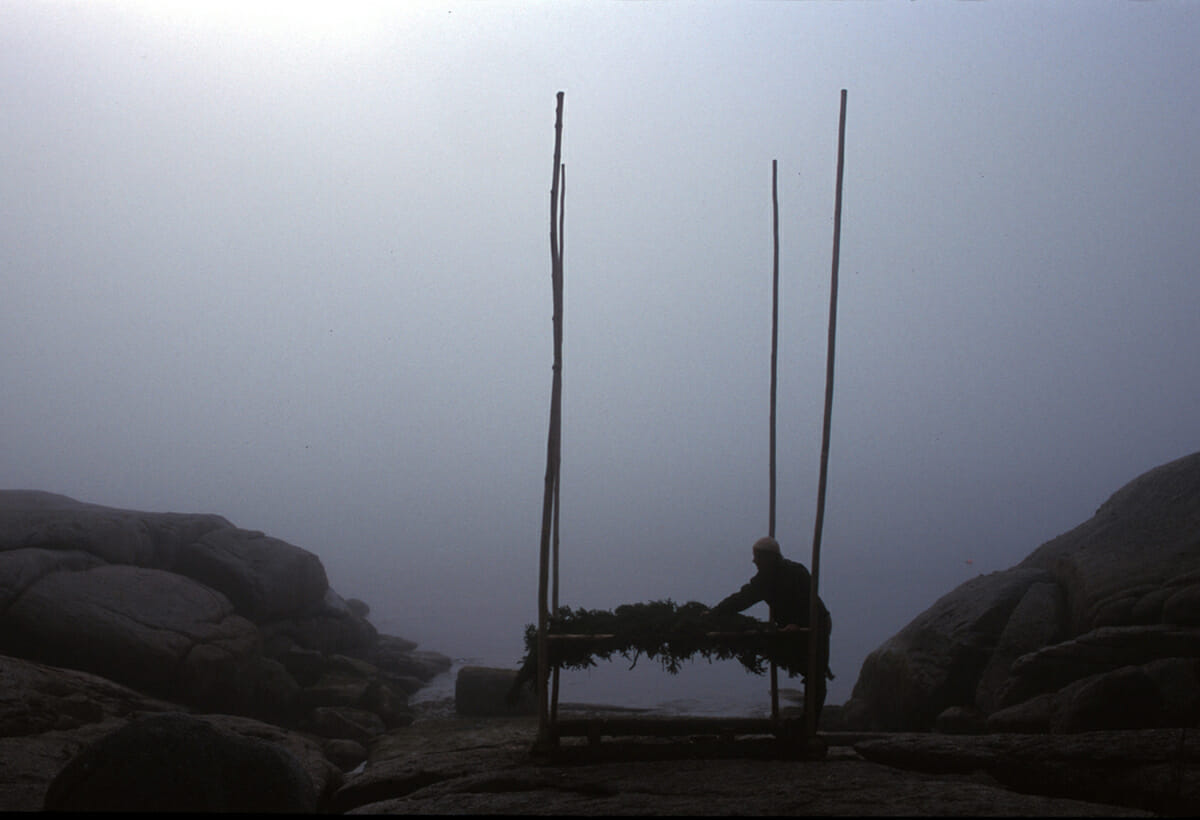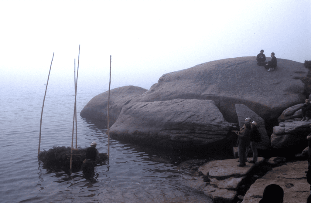 Wowhaus created a temporary installation that brought together participants to explore the role of the hand in the creative process. Characteristic of many Wowhaus site-specific projects, “craft” became a means of connecting with place and the forces of nature. Scott worked closely with Haystack staff to develop a low-impact program, culling fallen fir and spruce trees as material; the surrounding forest and tidal beach became both site and studio. Hand tools were used to craft a four post, 20′ tall, bed/raft that was launched into Jericho Bay. Participants stripped poles, assembled the structure, and wove a “mattress” of live fir boughs. After the launching, the structure was disassembled and materials were returned to their original locations – altered yet left to the elements, hopefully to inspire future projects by Haystack students.
