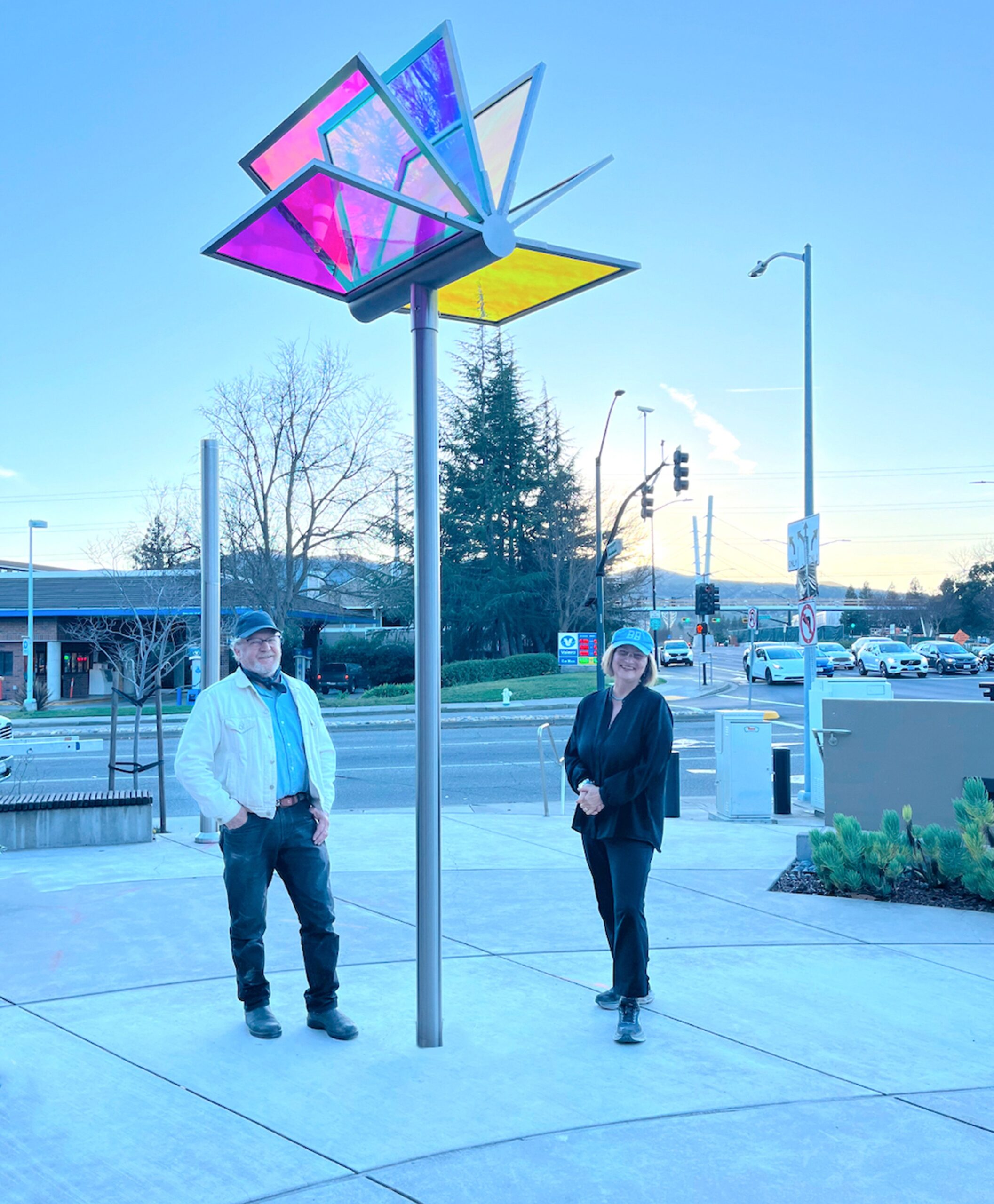 Heralding the entryway to the Public Library, this prismatic sculpture symbolizes the library’s rich array of resources as well as  the spectrum of cultures in this diverse community. Featuring shimmering dichroic glass and stainless steel, the landmark sculpture is ever-changing in sunlight,  casting colored light on passerby as they enter. The light from “pages” bounce off each other, creating infinite light effects that engage library patrons.