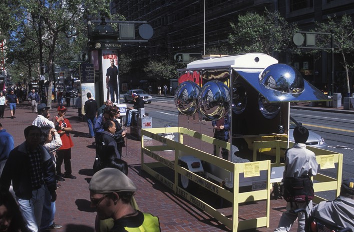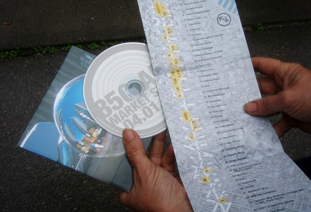 One of San Francisco’s main thoroughfares, Market Street remains true to its name, transecting & linking a wide array of communities or “markets”. “Life on Market Street: An Audio Archive”, was an attempt to understand contemporary Market Street by “mapping” everyday conversations with people who live & work along Market Street, capturing the ephemeral interactions that often escape documentation. As a self-guided walking tour, the audio archive is a portrait in sound that engages the public as both subject matter & navigational tool. On April 1, 2004, we distributed 2,000 free copies of the CD & map along Market Street. The audio was also transmitted from a mirrored mobile micro radio studio from sites along the street, bridging the “vertical audience” in office buildings with those along the street. The studio housed a solar-powered AM radio transmitter that was used to broadcast the compiled recordings along Market Street. The Audio Archive is part of the collection of the San Francisco Library’s History Room.