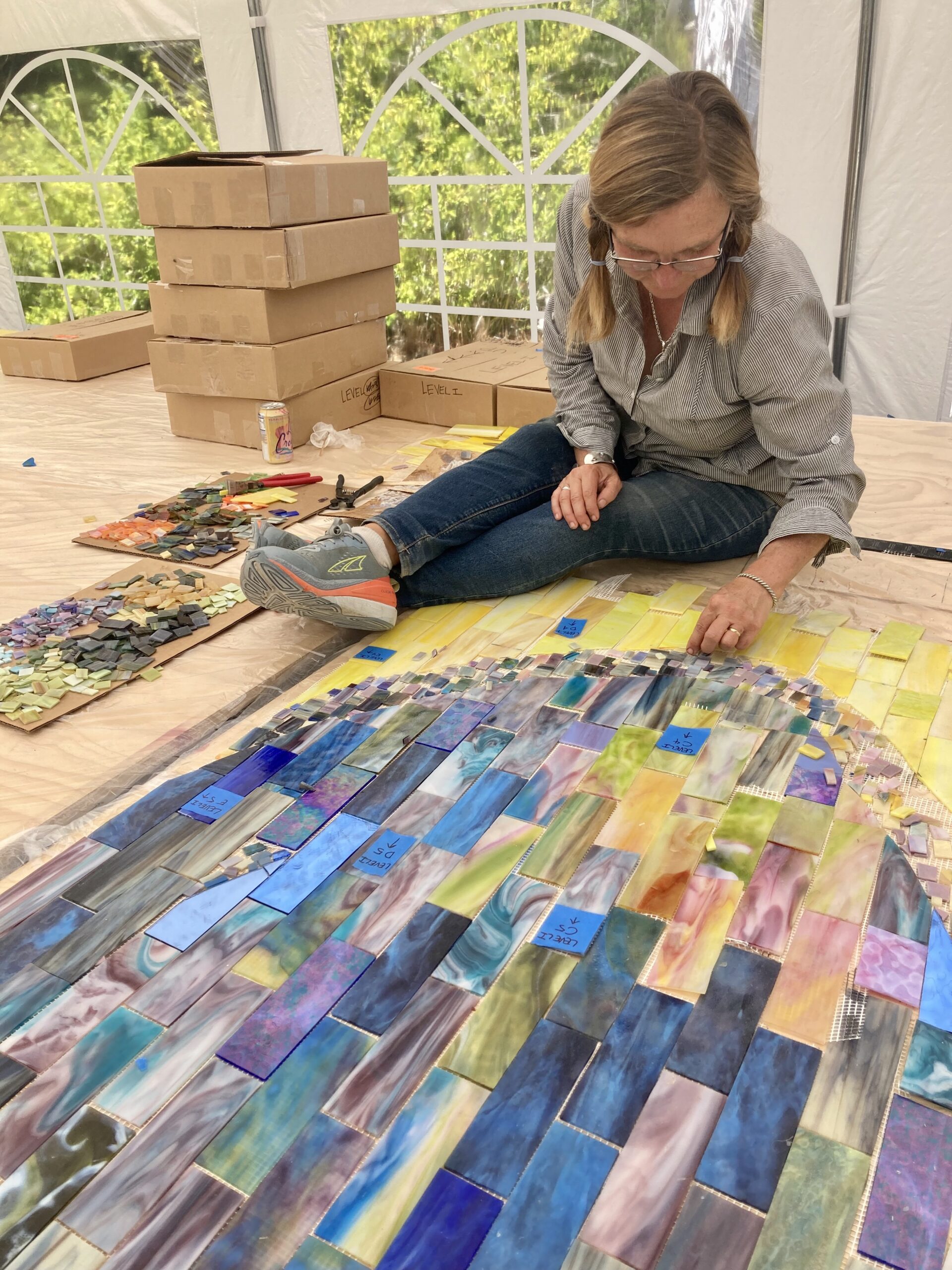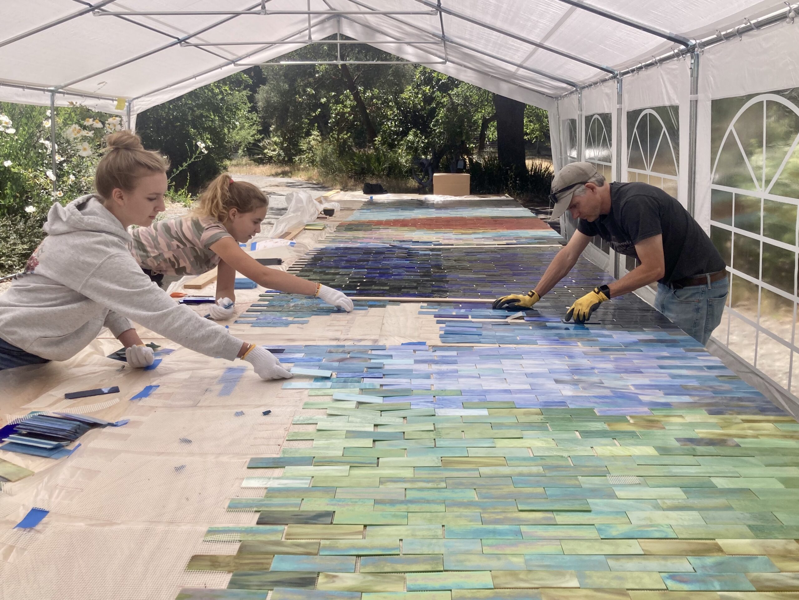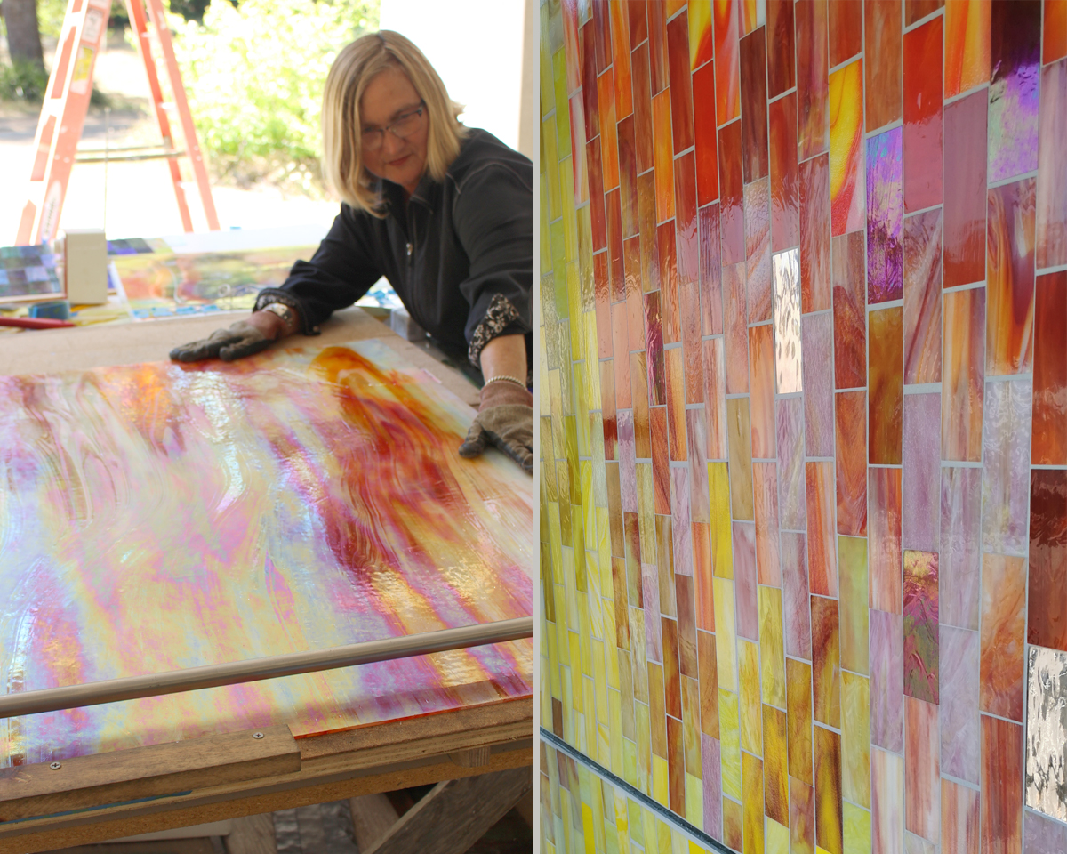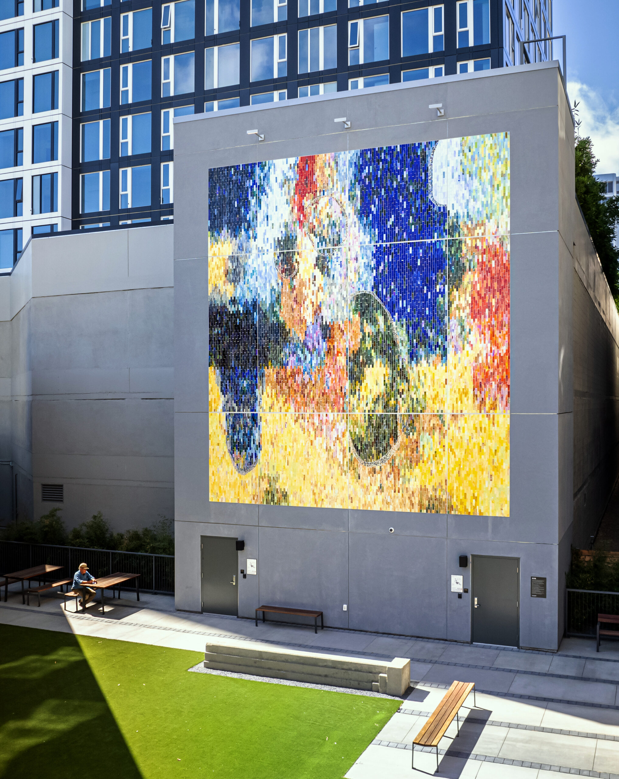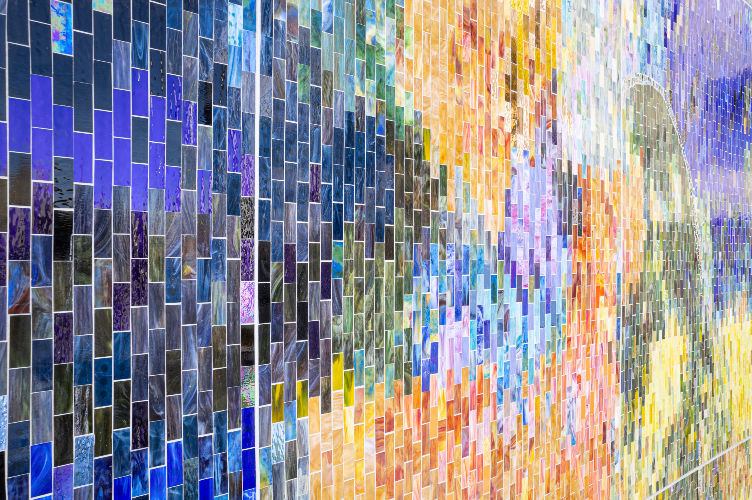 A landmark 30′ l x 28′ w mosaic mural activates a large wall in a new development in the heart of Oakland. Rendered in thousands of pieces of hand-cut glass, opalescent glass and mirrored glass, the artwork offers fresh perspective on a familiar icon of Oakland – the oak tree. The painterly, abstract composition takes inspiration from photographs of an acorn bract taken under a microscope. The shimmering spectrum of colors in the mosaic artwork evokes the cultural diversity of Oakland and offers unique insight into the beauty of the Oakland native ecosystem, revealing the extraordinary in the seemingly ordinary.