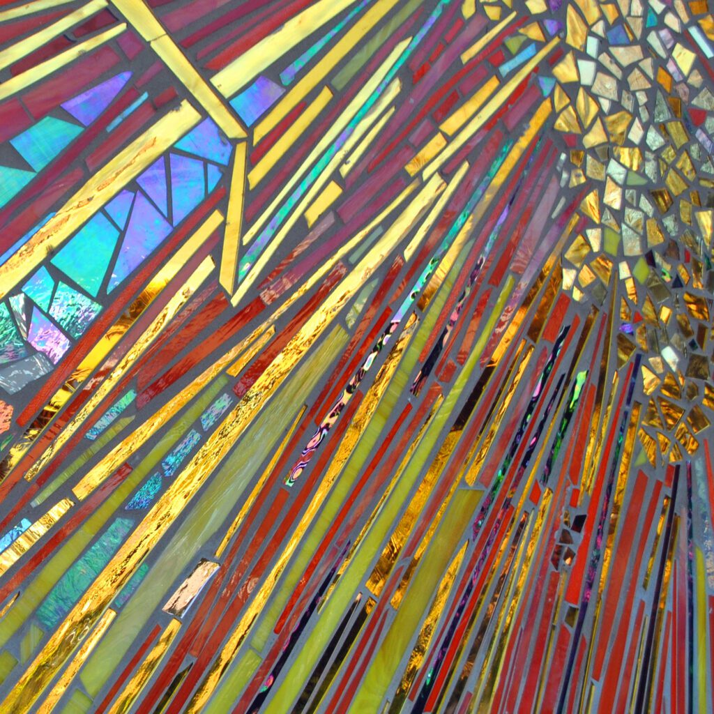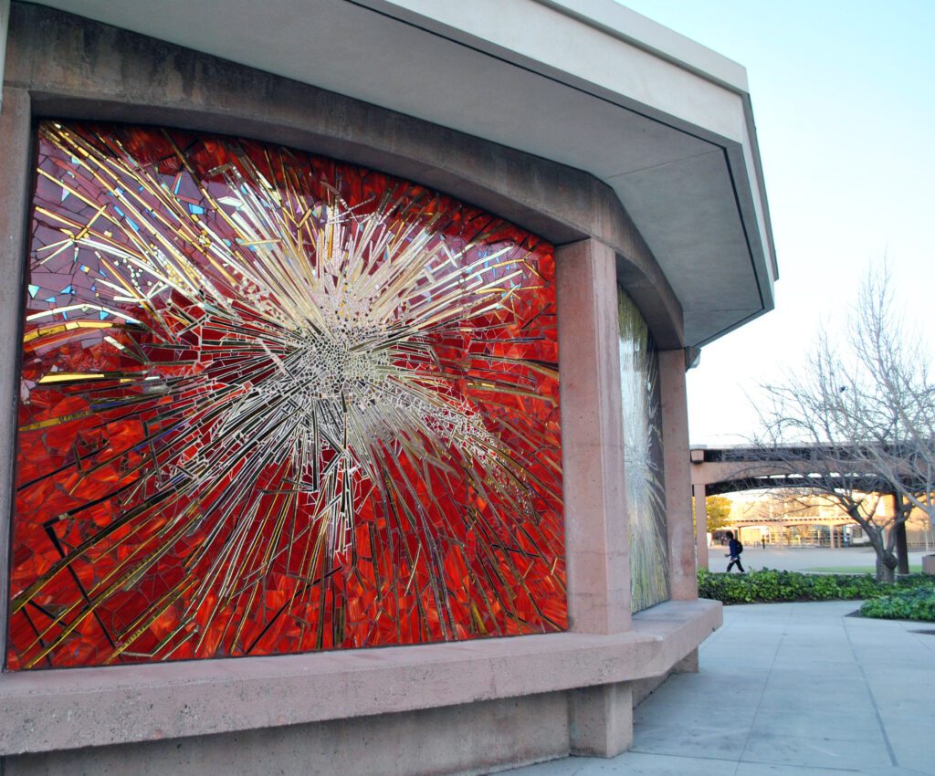 Wowhaus transformed an existing planetarium was into a landmark on the campus via four architecturally integrated mosaic murals. Created from thousands of pieces of hand-cut glass, iridescent glass and mirror, the four 10’ h x 12’ wide murals feature abstract images of a spark. The imagery evokes the spark of inspiration, creativity and insight fostered through education at the college; the spark also references the spirit of scientific inquiry and the cosmos. Imagery was inspired by dialogue with the college community, including students, faculty and staff. Iridescent glass and mirror cast colored light on passerby, shifting with the passage of the sun throughout the day.