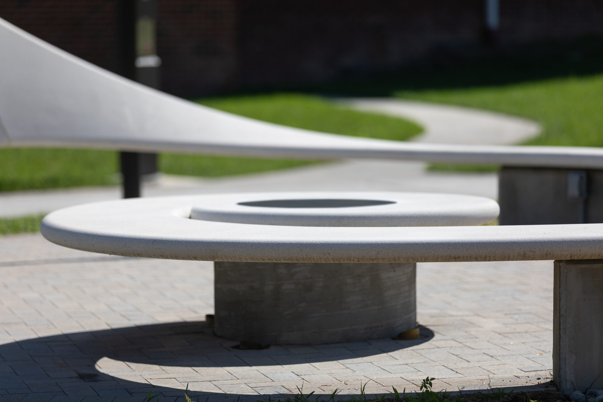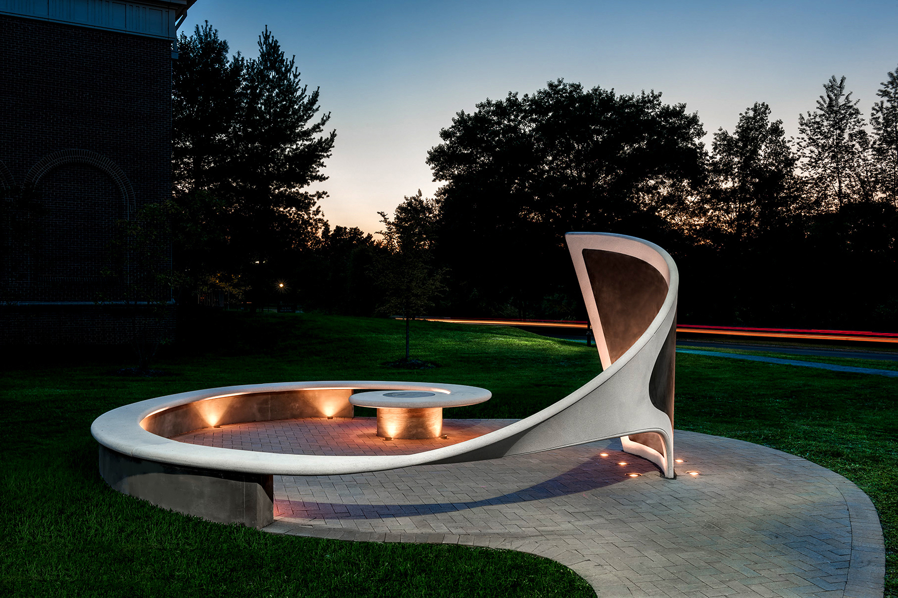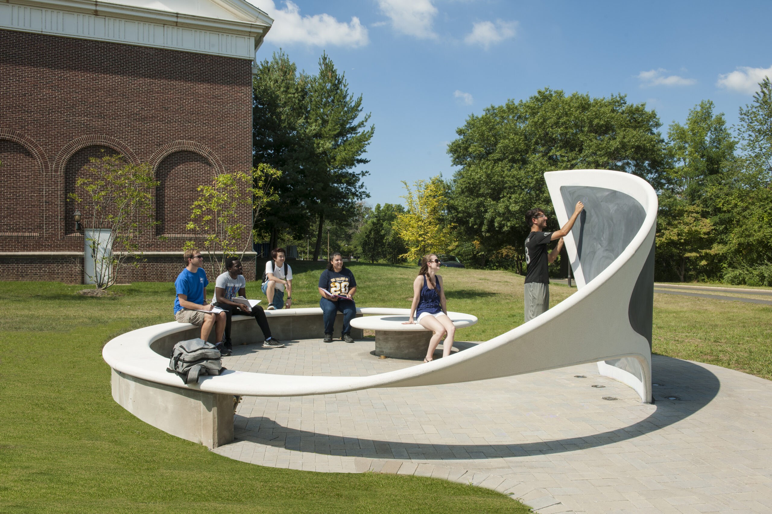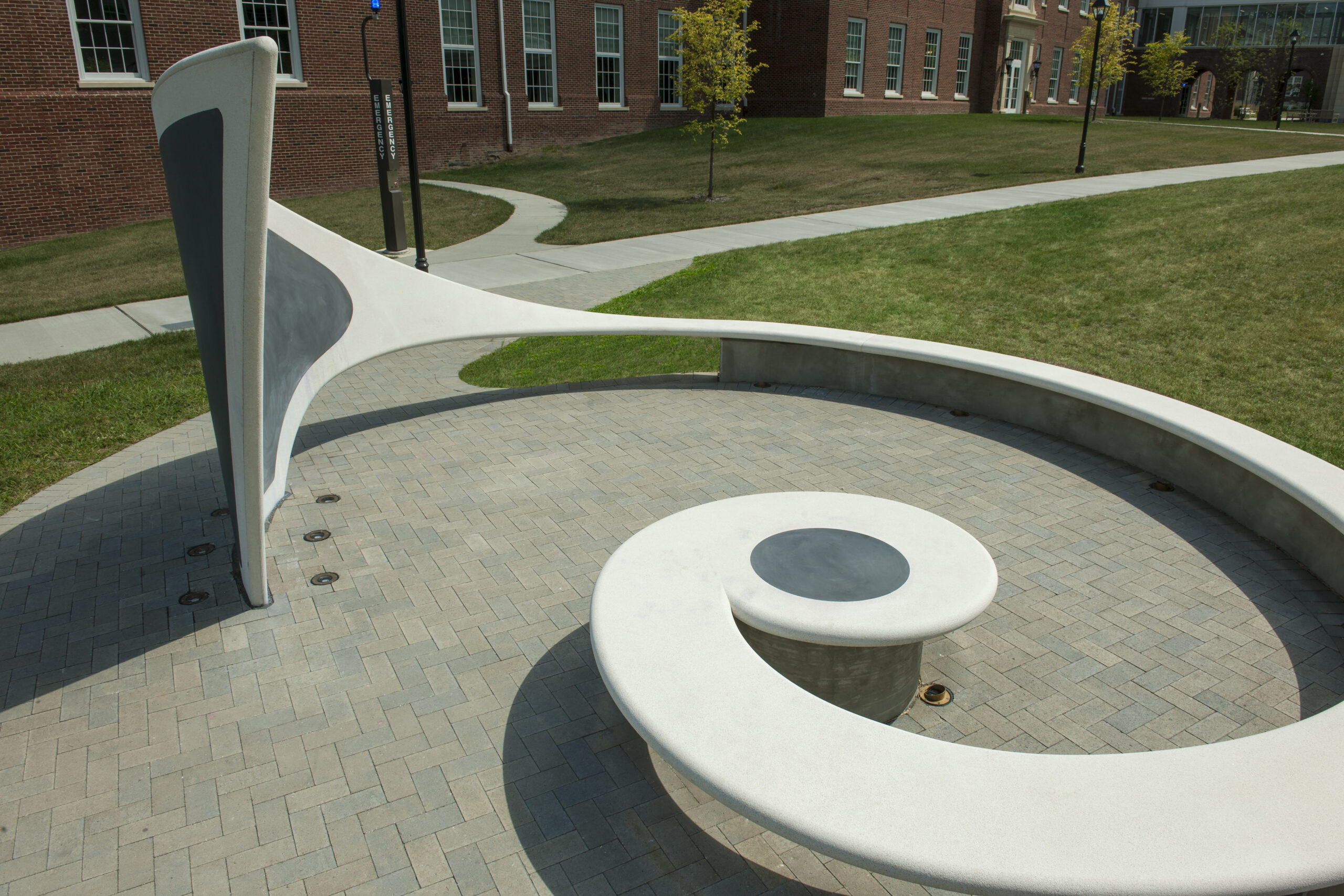 Inspired by the Golden Ratio, this 28′ w landmark functional sculpture creates an outdoor classroom and a community gathering site. Sculpture is a focal point of the STEM complex, serving as an icon for the College and embodying the search for knowledge and insight via higher education. The pursuit of beauty, of underlying order, lies at the core of intellectual inquiry. Explored since ancient times, and made popular through work of Leonardo Fibonacci and Johannes Kepler in the Middle Ages, the Golden Ratio is visualized here as a logarithmic spiral.
