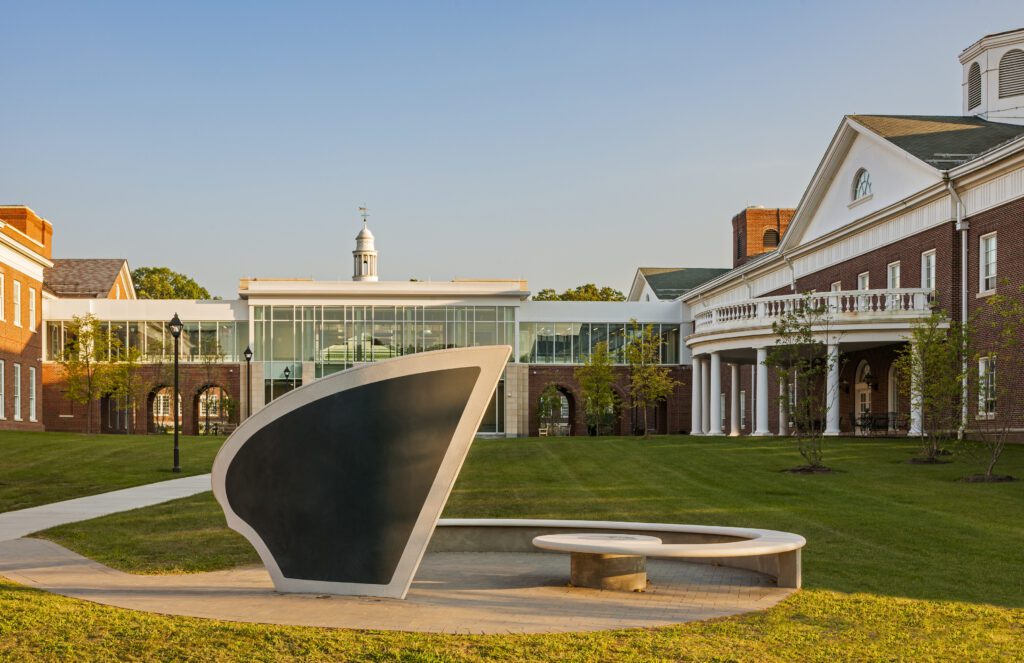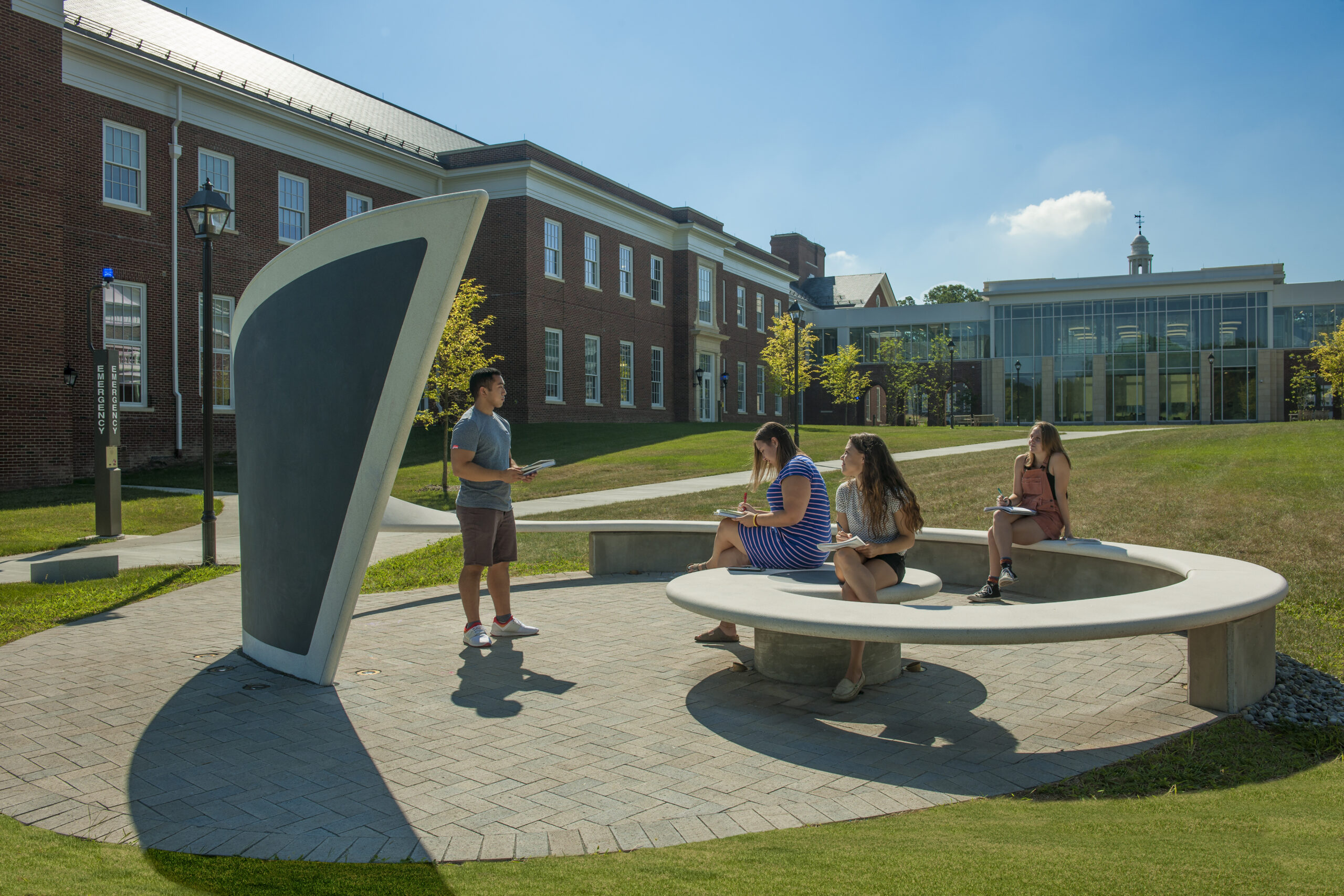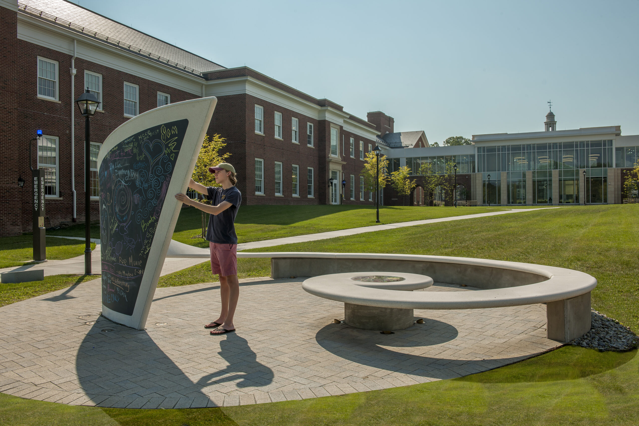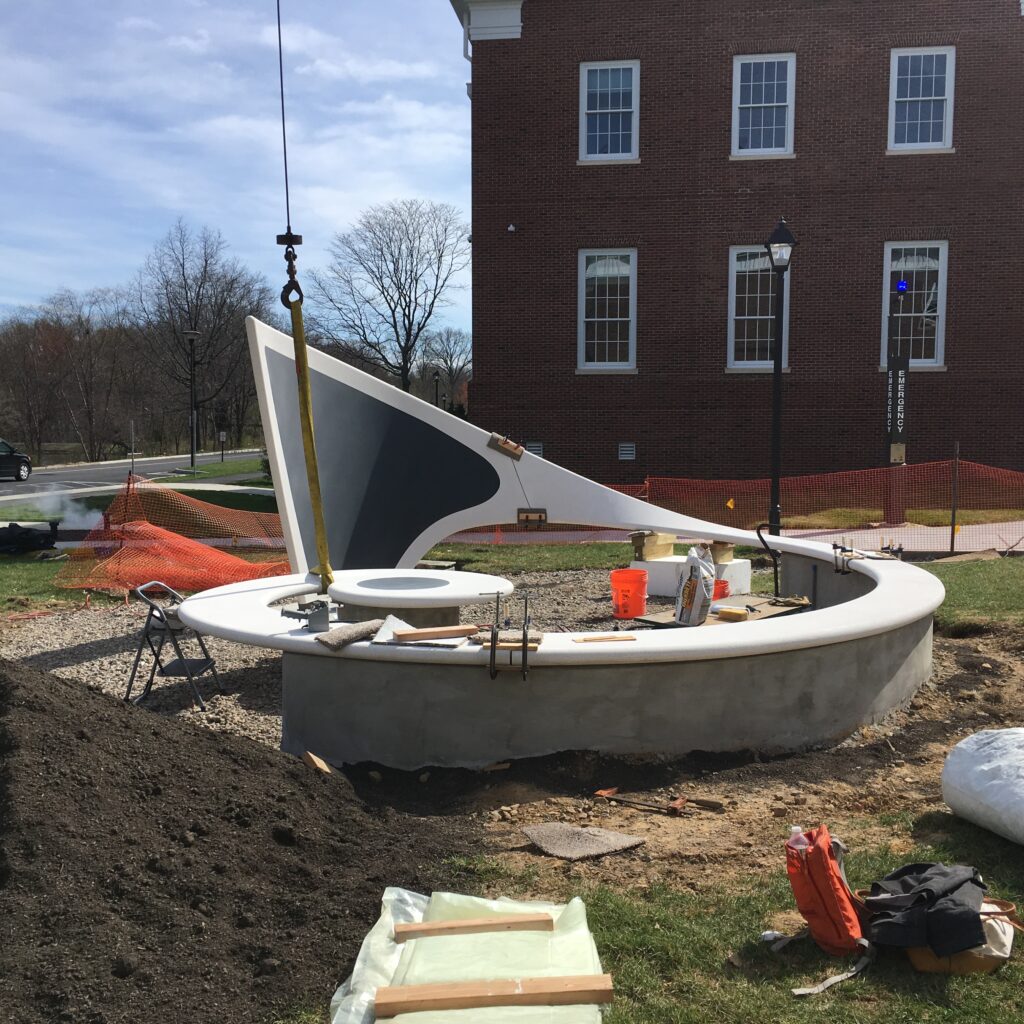 Inspired by the Golden Ratio, this 28′ w landmark functional sculpture creates an outdoor classroom and a community gathering site. Sculpture is a focal point of the STEM complex, serving as an icon for the College and embodying the search for knowledge and insight via higher education. The pursuit of beauty, of underlying order, lies at the core of intellectual inquiry. Explored since ancient times, and made popular through work of Leonardo Fibonacci and Johannes Kepler in the Middle Ages, the Golden Ratio is visualized here as a logarithmic spiral.
