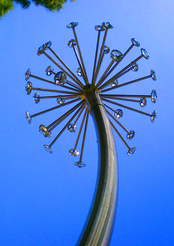Evoking the childhood tradition of making wishes by blowing on dandelion seed heads, a series of three stainless steel sculptures are sited in a public park. Each seed head features thirty-eight 2 1/2″” Austrian crystals that catch the light, refracting sunlight in prismatic rainbows onto children who “catch” and play amidst the rainbows, including the many children who use wheelchairs and frequent the accessible playground nearby. Conversations with children inspired the artwork; local schoolchildren worked with Wowhaus, making a wish on each of the crystals before they were incorporated in the sculptures.