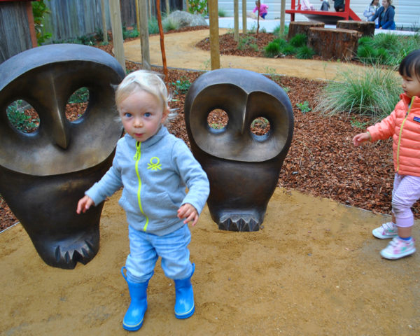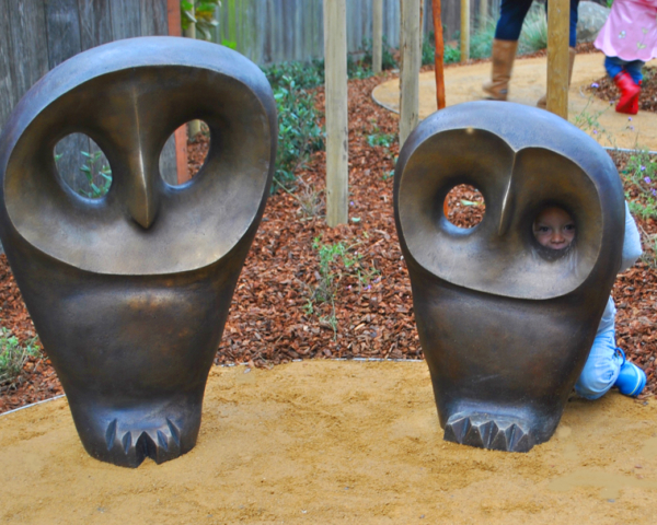 Two engaging interactive bronze owl sculptures feature voids for eyes, inviting children to peer through, literally and figuratively seeing the world through the birds’ eyes. Highly durable sculptures are integrated with native plantings in an urban public park.