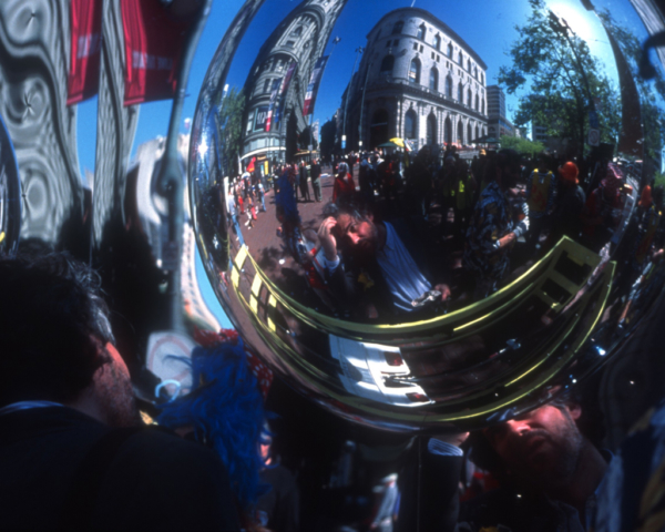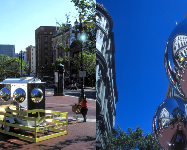 One of San Francisco’s main thoroughfares, Market Street remains true to its name, transecting & linking a wide array of communities or “markets”. “Life on Market Street: An Audio Archive”, was an attempt to understand contemporary Market Street by “mapping” everyday conversations with people who live & work along Market Street, capturing the ephemeral interactions that often escape documentation. As a self-guided walking tour, the audio archive is a portrait in sound that engages the public as both subject matter & navigational tool. On April 1, 2004, we distributed 2,000 free copies of the CD & map along Market Street. The audio was also transmitted from a mirrored mobile micro radio studio from sites along the street, bridging the “vertical audience” in office buildings with those along the street. The studio housed a solar-powered AM radio transmitter that was used to broadcast the compiled recordings along Market Street. The Audio Archive is part of the collection of the San Francisco Library’s History Room.